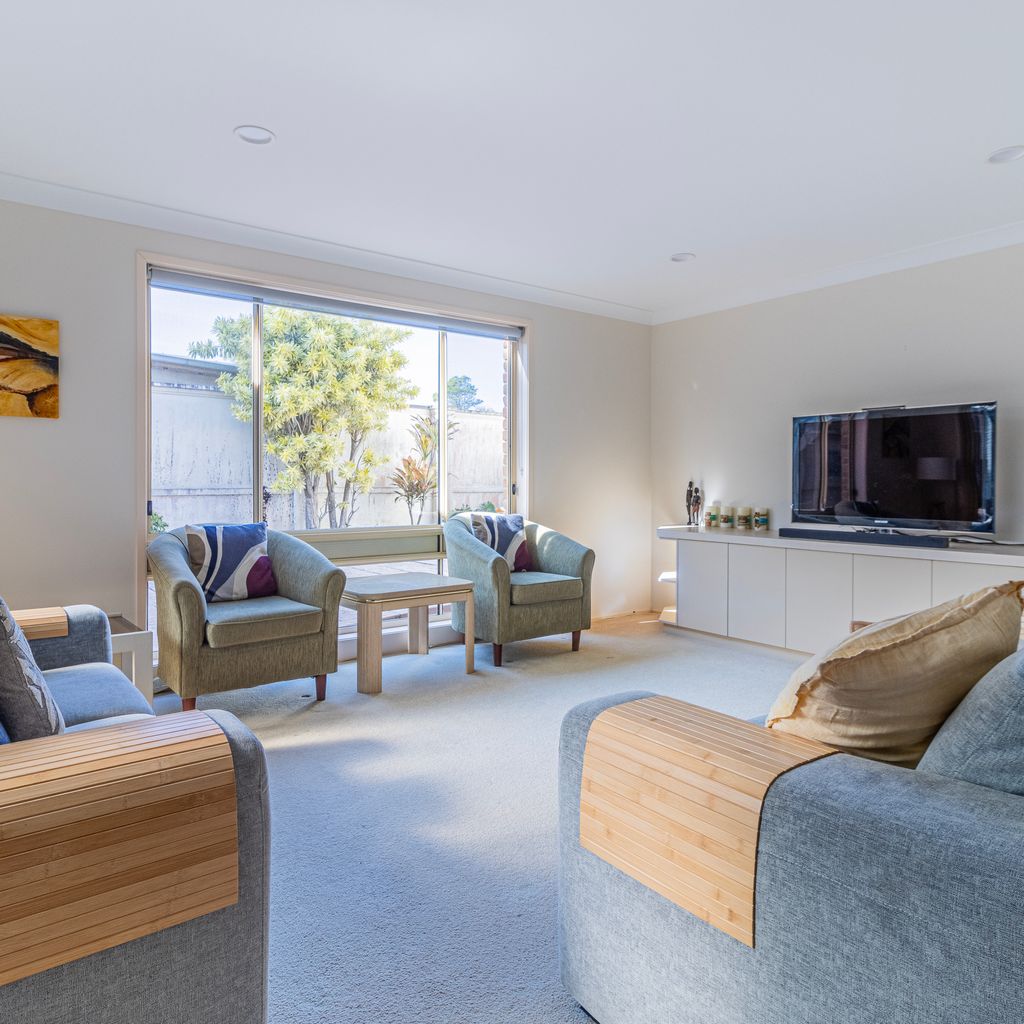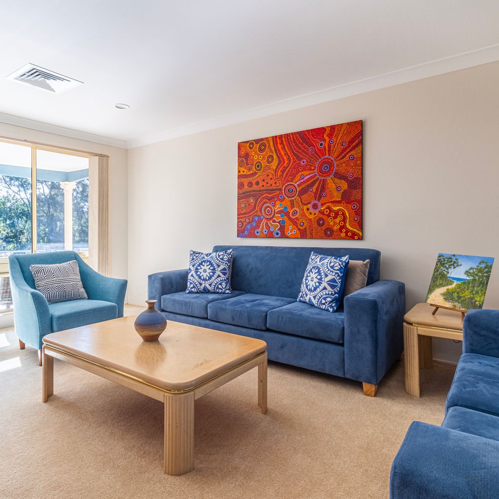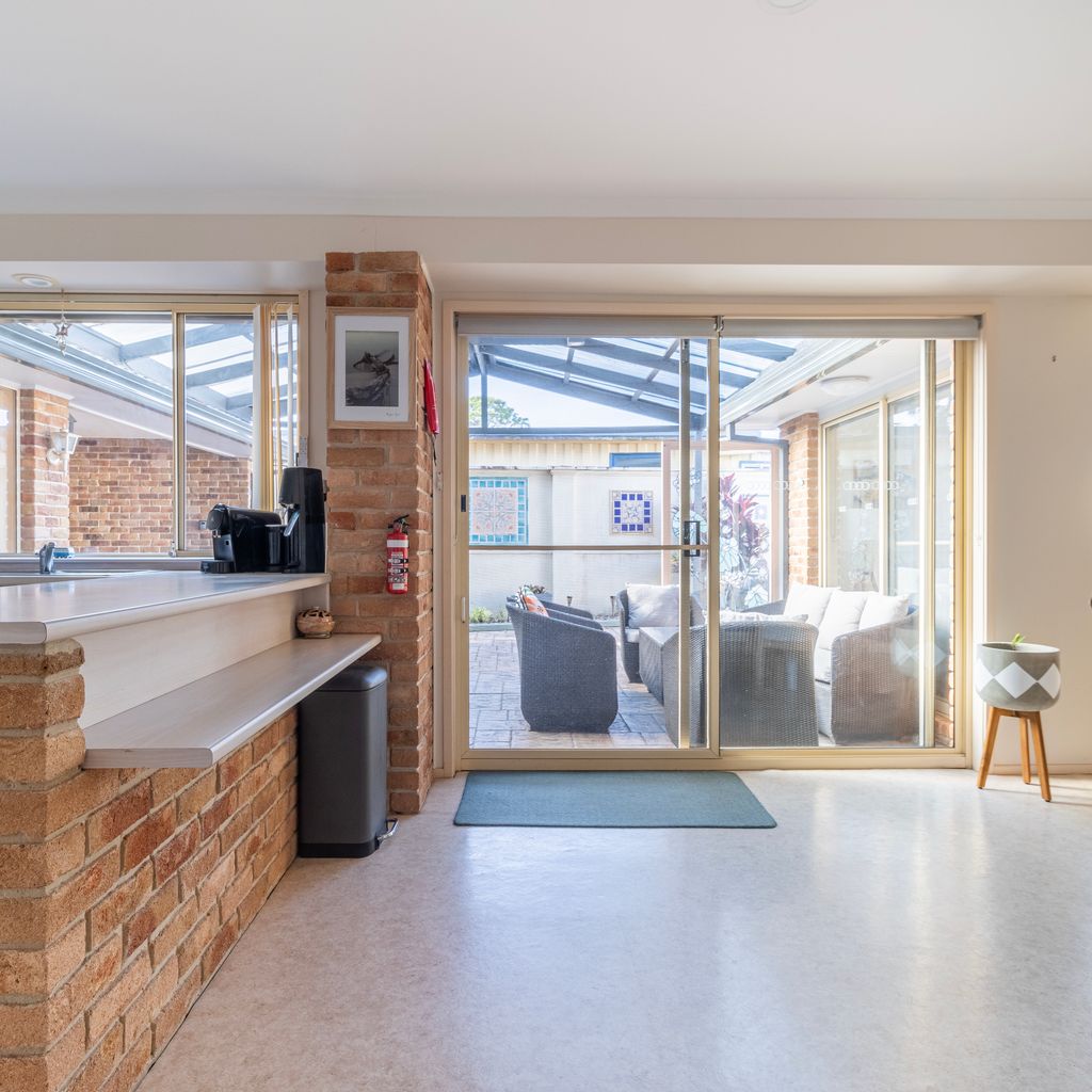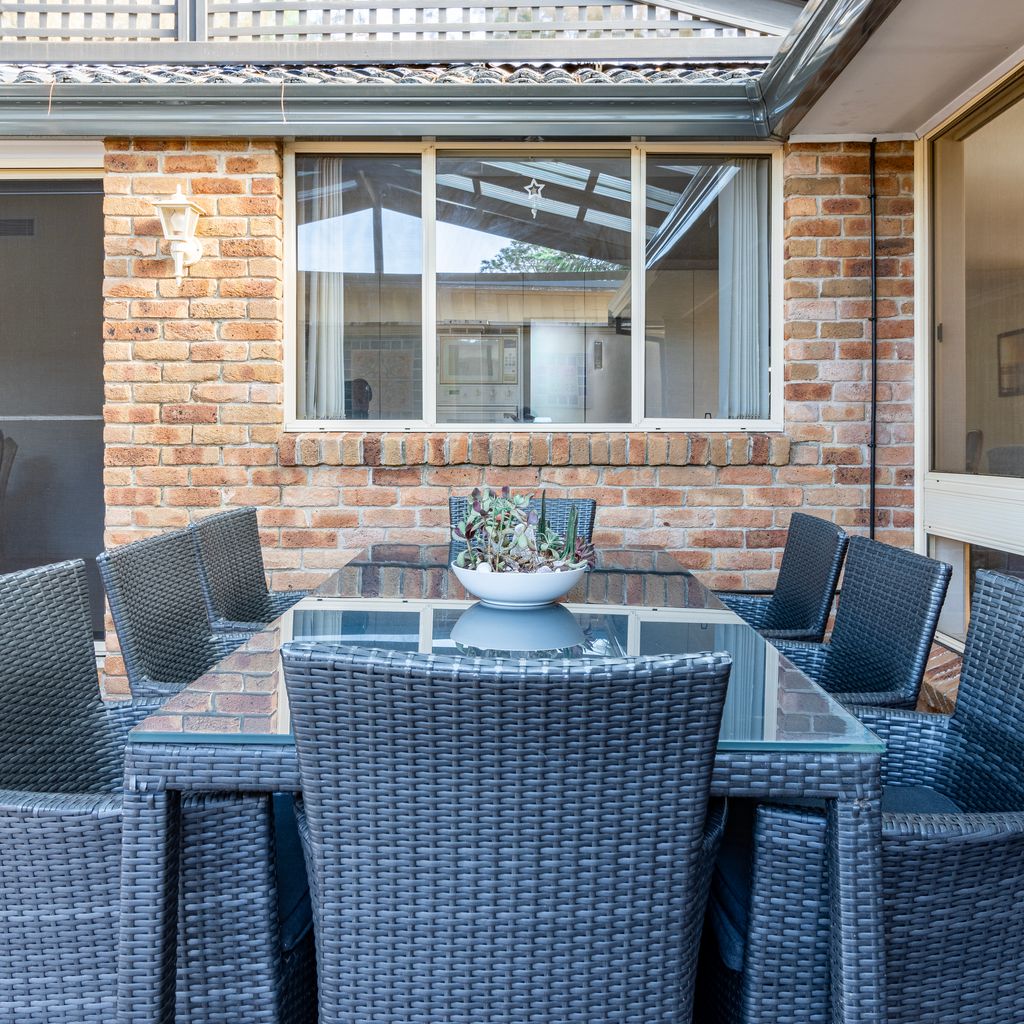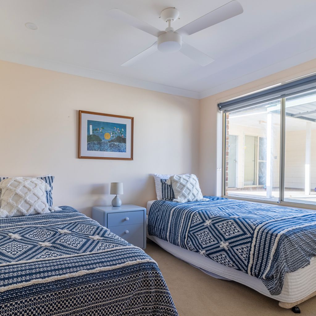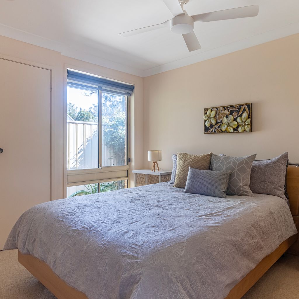 As you arrive at Berrara Breeze, you'll enter through the side gate, where you're greeted by a welcoming patio furnished with an outdoor lounge and dining table—an ideal spot to unwind after a day at the beach or out on the water. A large ceiling fan ensures comfort during warm summer days.
