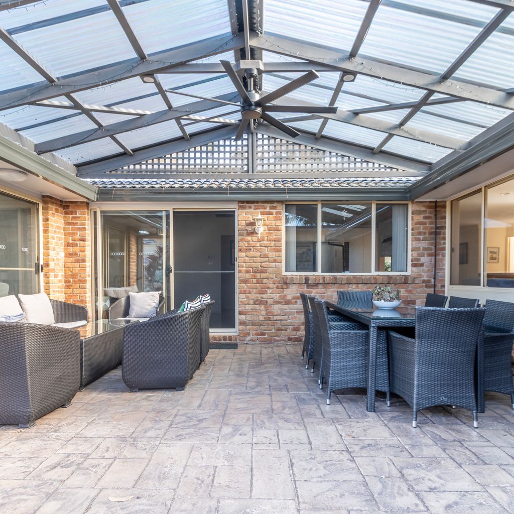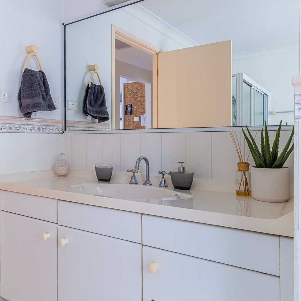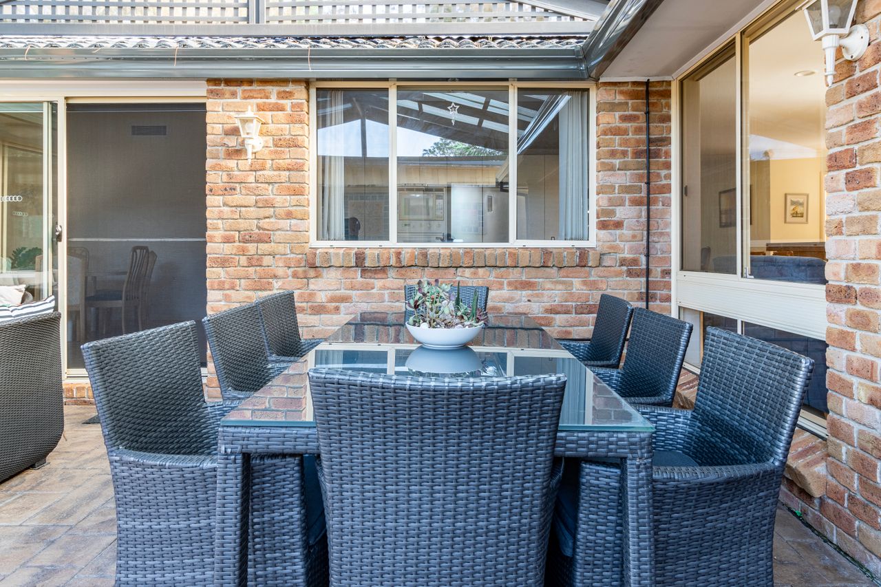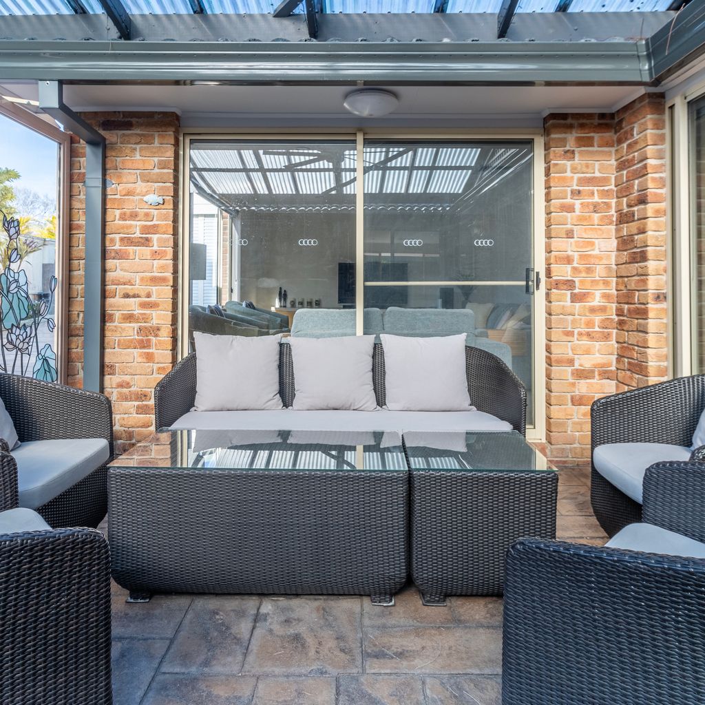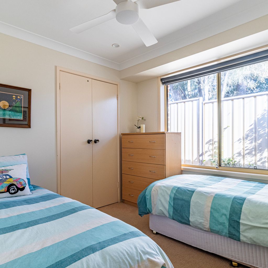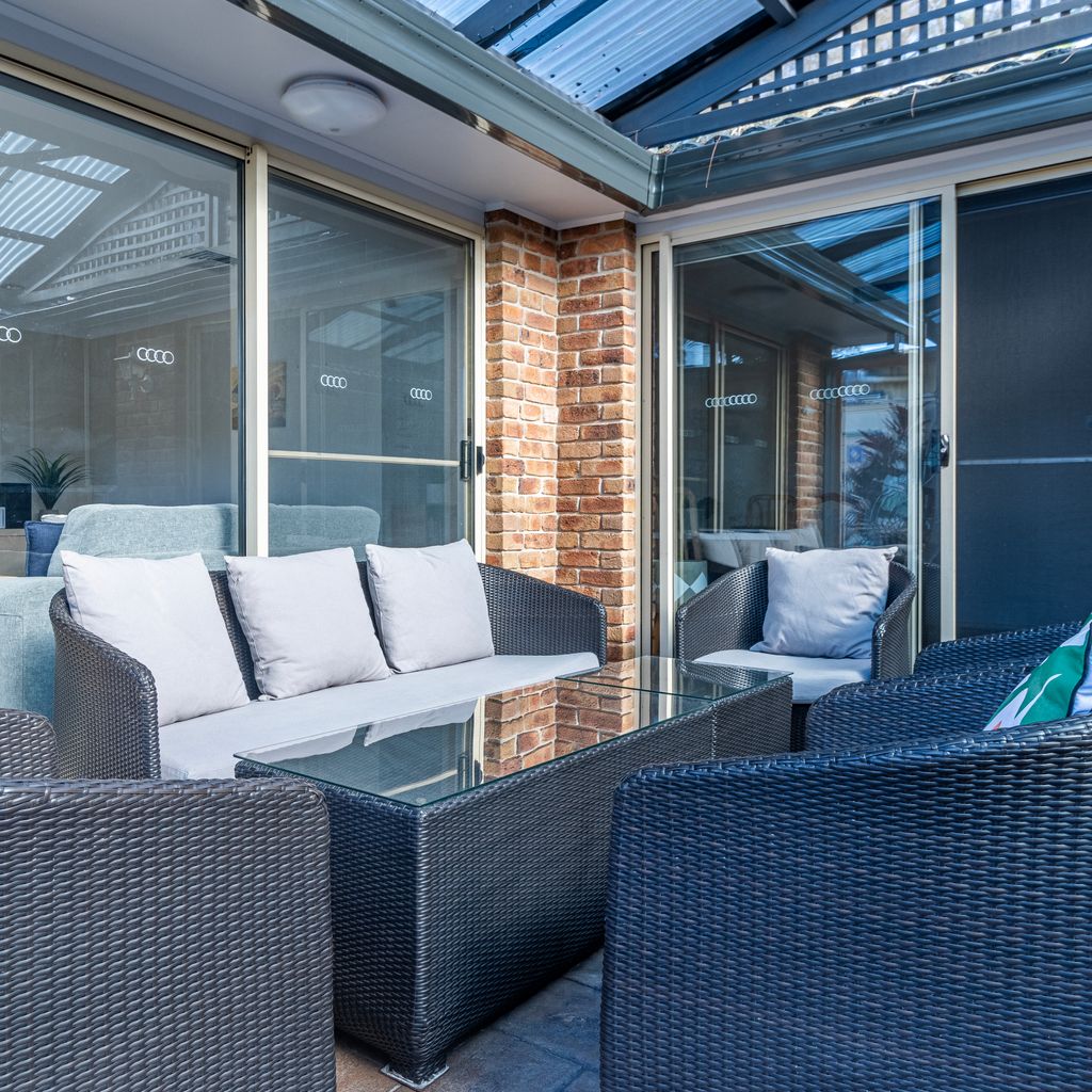 As you arrive at Berrara Breeze, you'll enter through the side gate, where you're greeted by a welcoming patio furnished with an outdoor lounge and dining table—an ideal spot to unwind after a day at the beach or out on the water. A large ceiling fan ensures comfort during warm summer days.