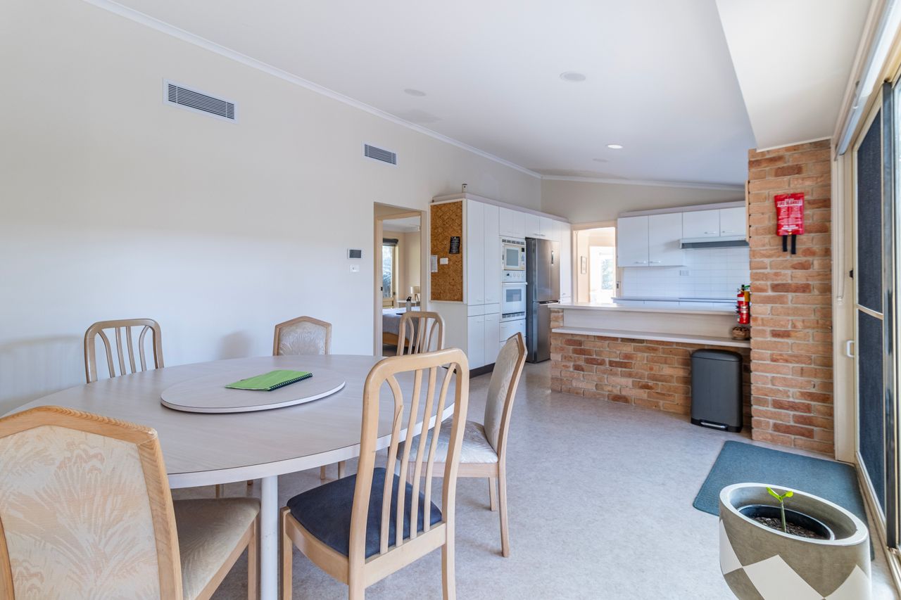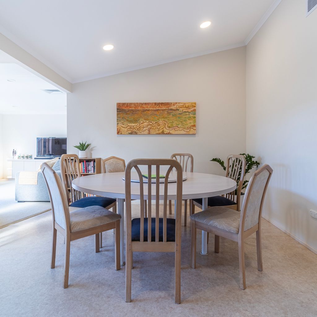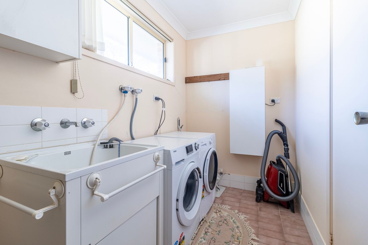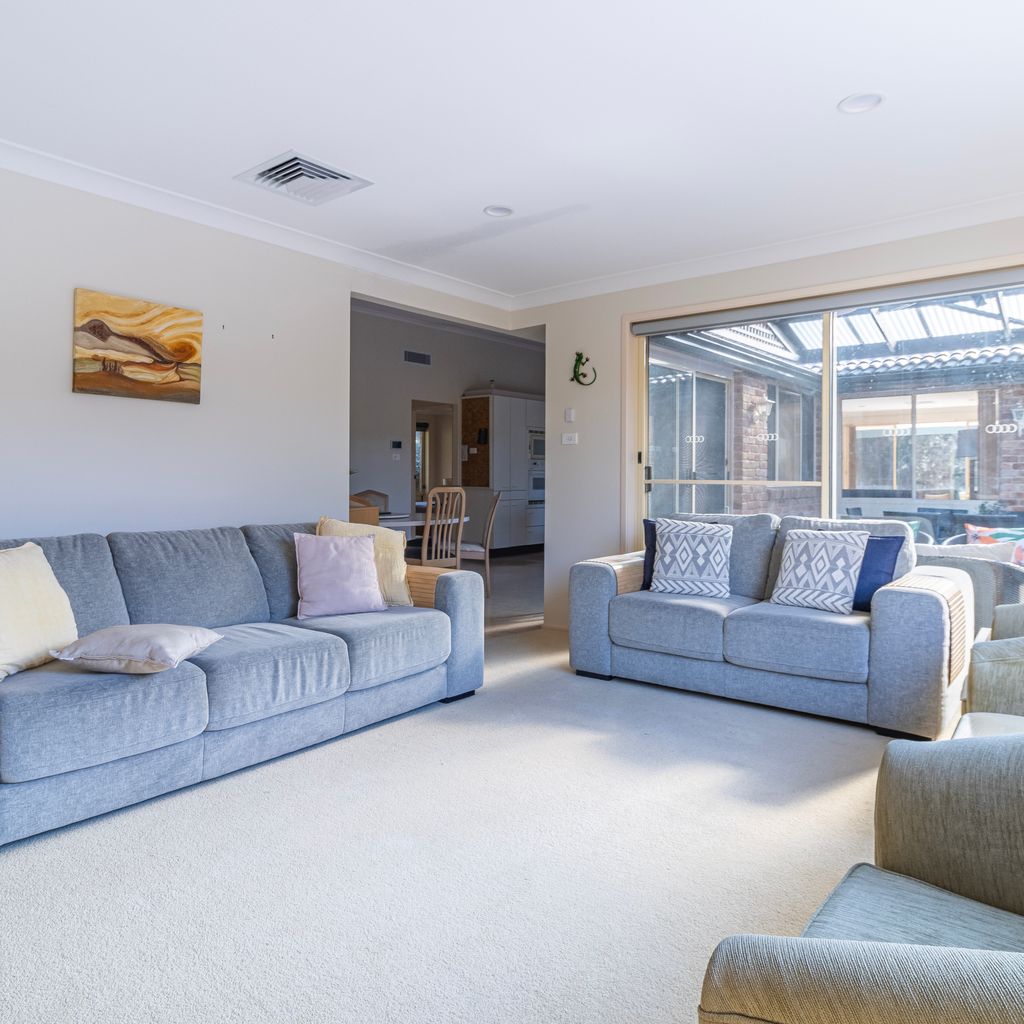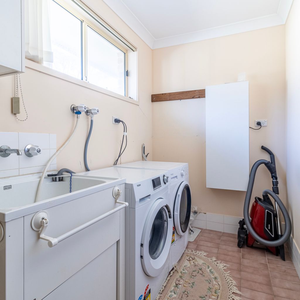 A hallway leads from the dining area to three of the four bedrooms, the main bathroom, and the laundry. Each bedroom is equipped with ducted air conditioning to maintain the perfect temperature year-round, as well as ceiling fans and built-in wardrobes for your convenience. The main bathroom is spacious, featuring a large vanity, a full bathtub, and a shower, while the laundry is equipped with both a washer and dryer.