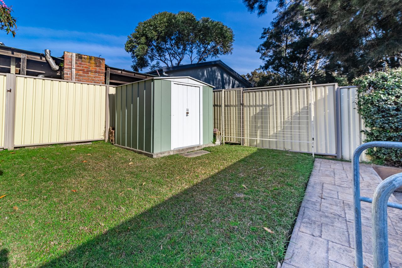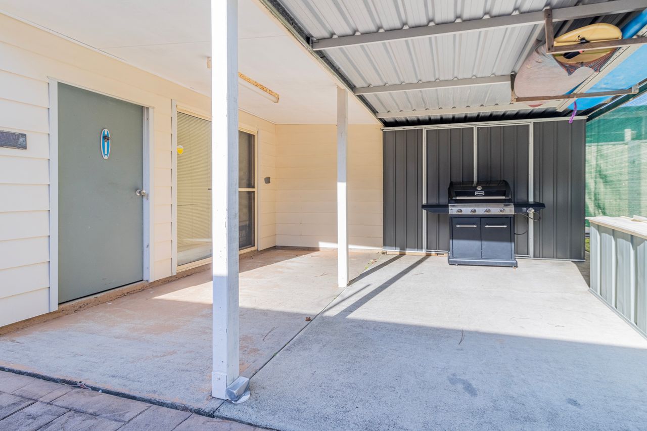 The backyard is a tranquil space with a small patio area for BBQs and a grassed area, perfect for outdoor dining or simply relaxing in the fresh coastal air.