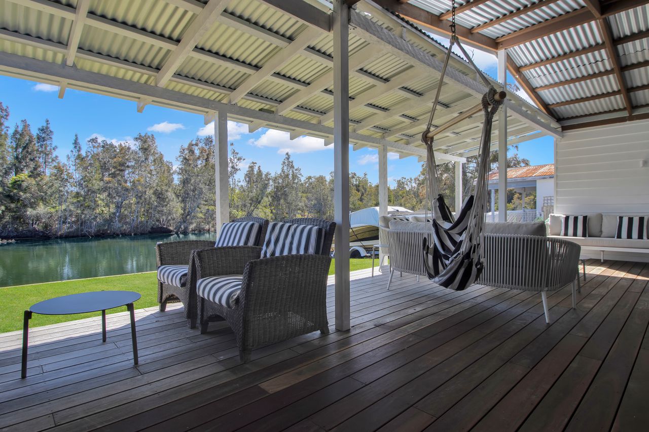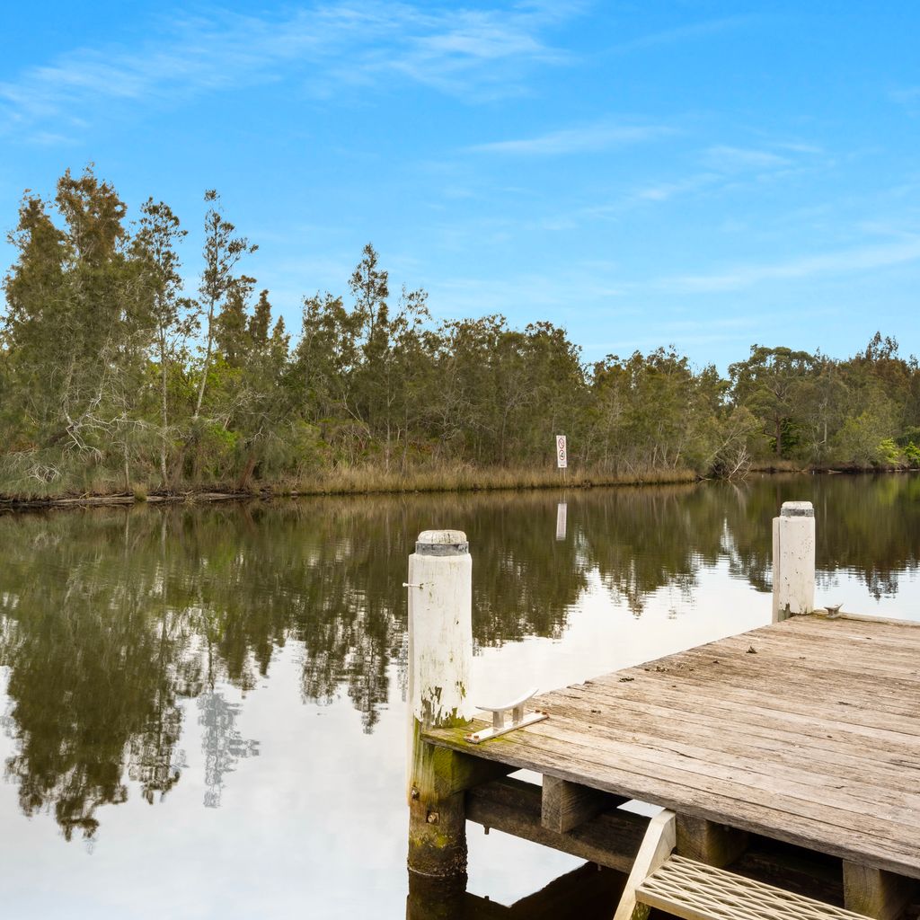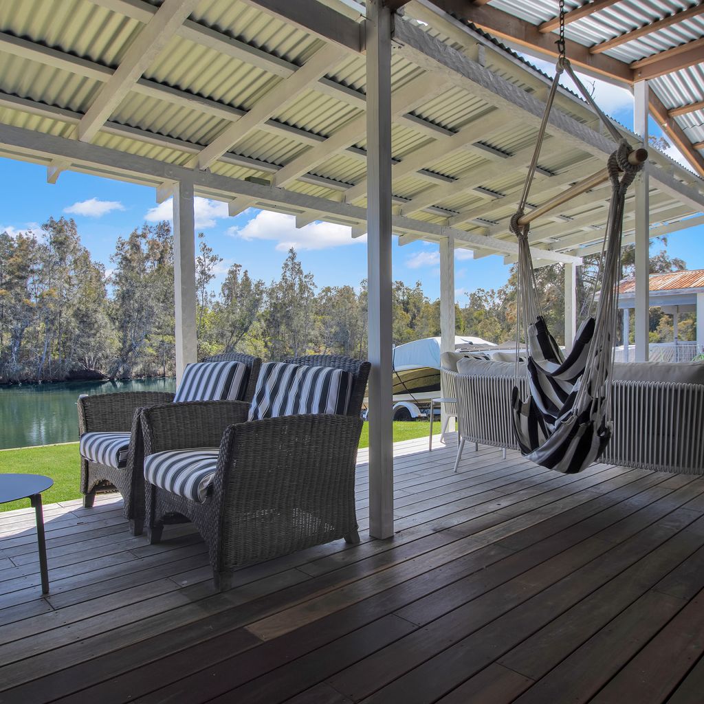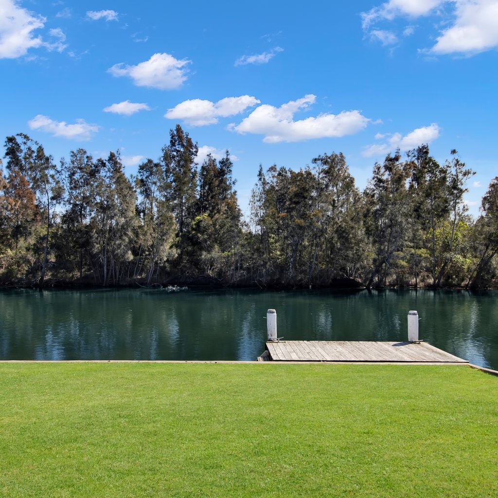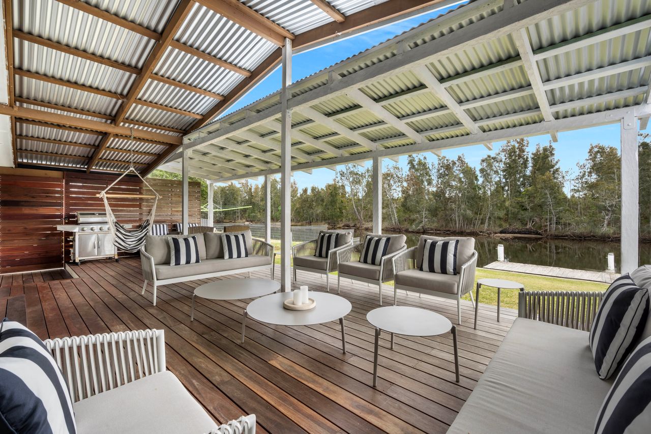 The back deck has been styled with a variety of seating options to suit everyone, whether you’re looking to lounge in the sun or gather around for afternoon festivities. A well-positioned BBQ makes it easy to cook up an afternoon gathering after a day exploring the waterways, while the grassed yard offers plenty of space for children to run and play. The private jetty provides direct access to the water, making it perfect for mooring your boat, swimming, fishing, or simply soaking up the tranquil views. A convenient ladder ensures safe and easy access back onto the jetty after a refreshing dip.