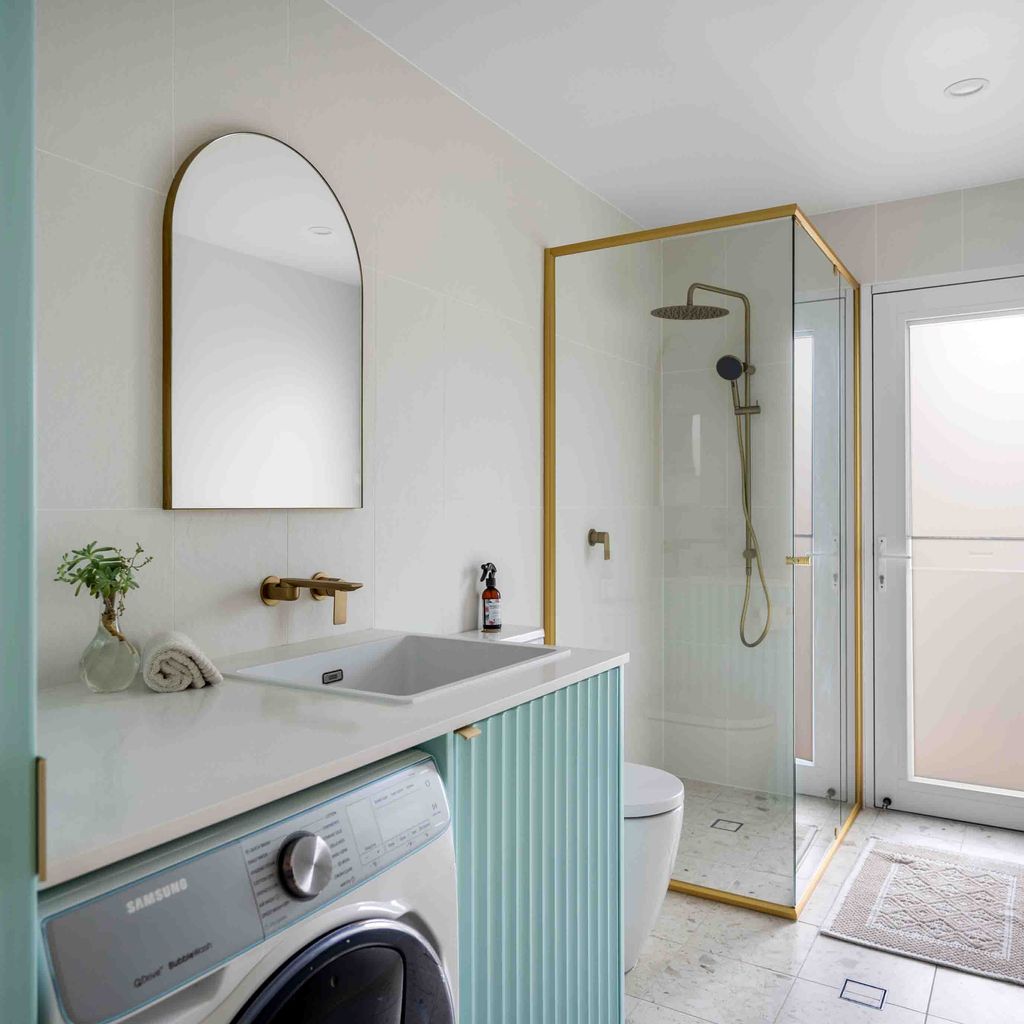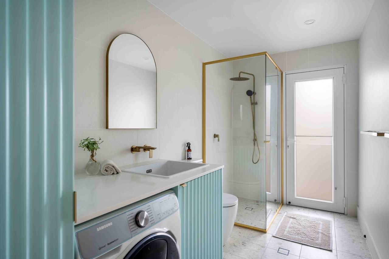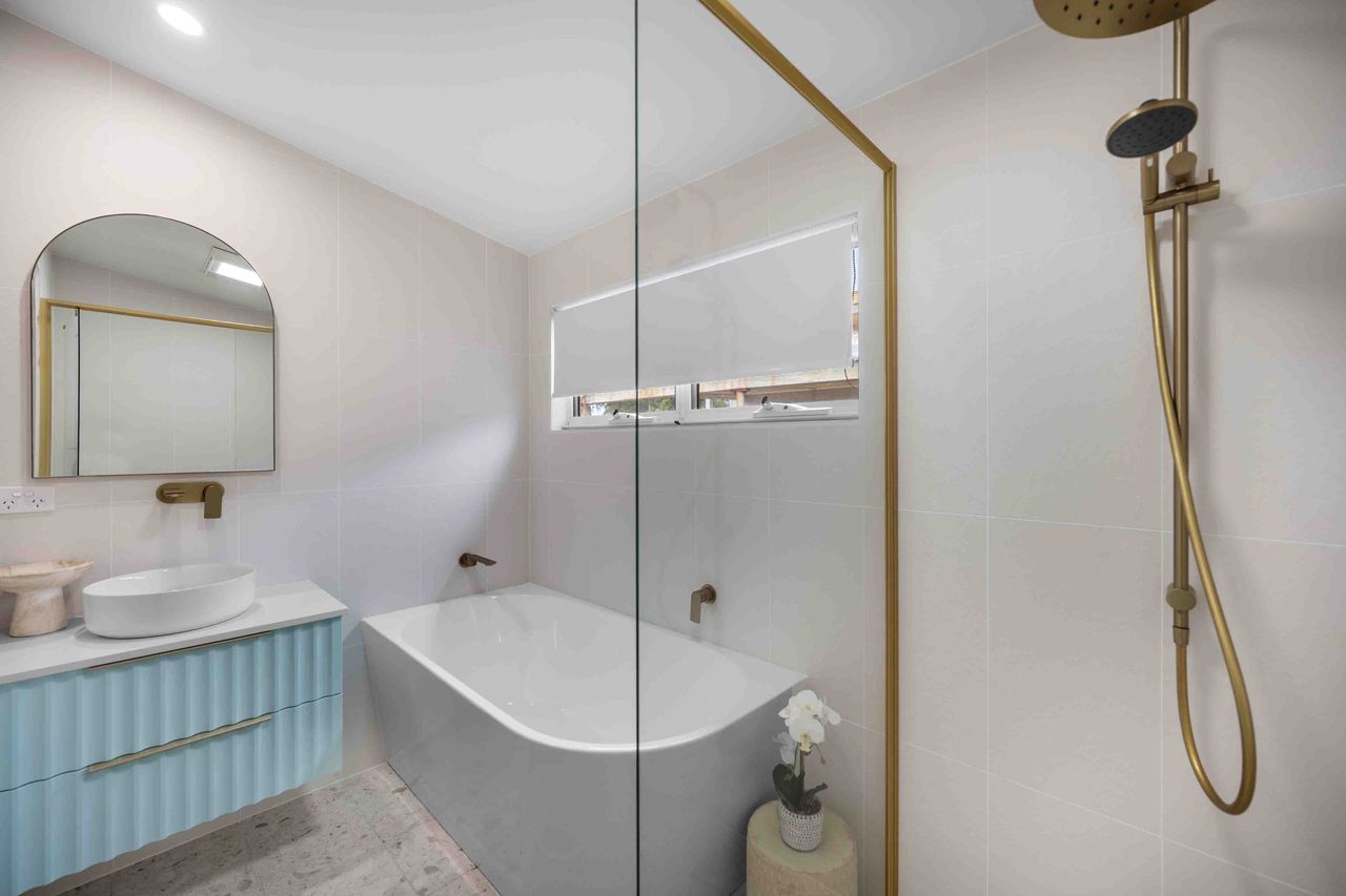 The two bathrooms have been thoughtfully designed, with the main bathroom featuring a separate toilet for added convenience, while the second bathroom shares space with the laundry, which includes a two-in-one washer and dryer. From the laundry, you can step out into a private, enclosed courtyard that features an outdoor shower and a clothesline, perfect for rinsing off after a swim or a day at the beach.