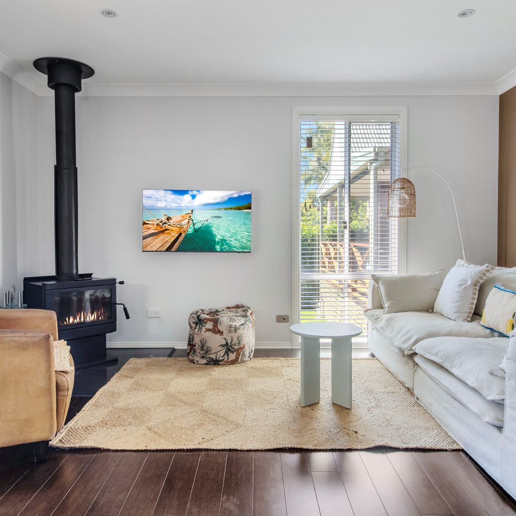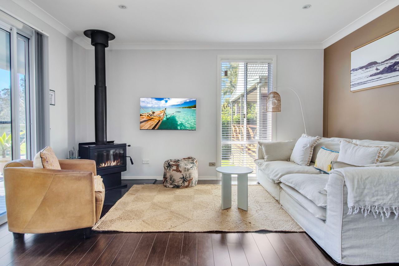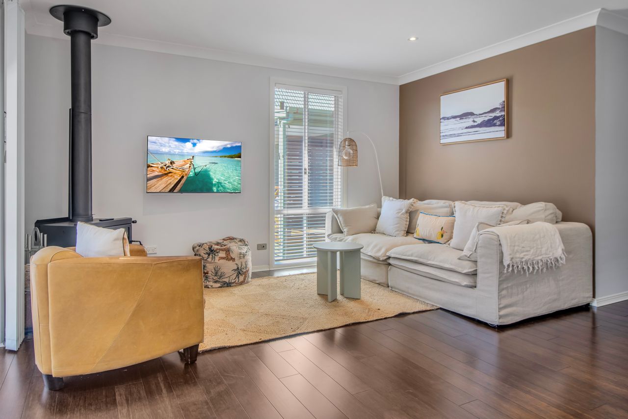 Stepping inside, you'll be greeted by an open-plan living area adorned with coastal-inspired touches. The lounge, dining room, and kitchen seamlessly flow together, creating a spacious and inviting atmosphere. Curl up beside the fireplace in the living area for cosy evenings spent in good company or simply unwind with your favourite book.