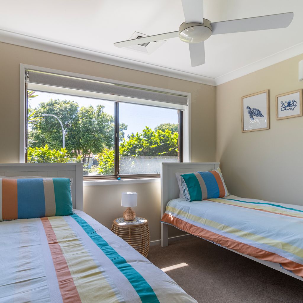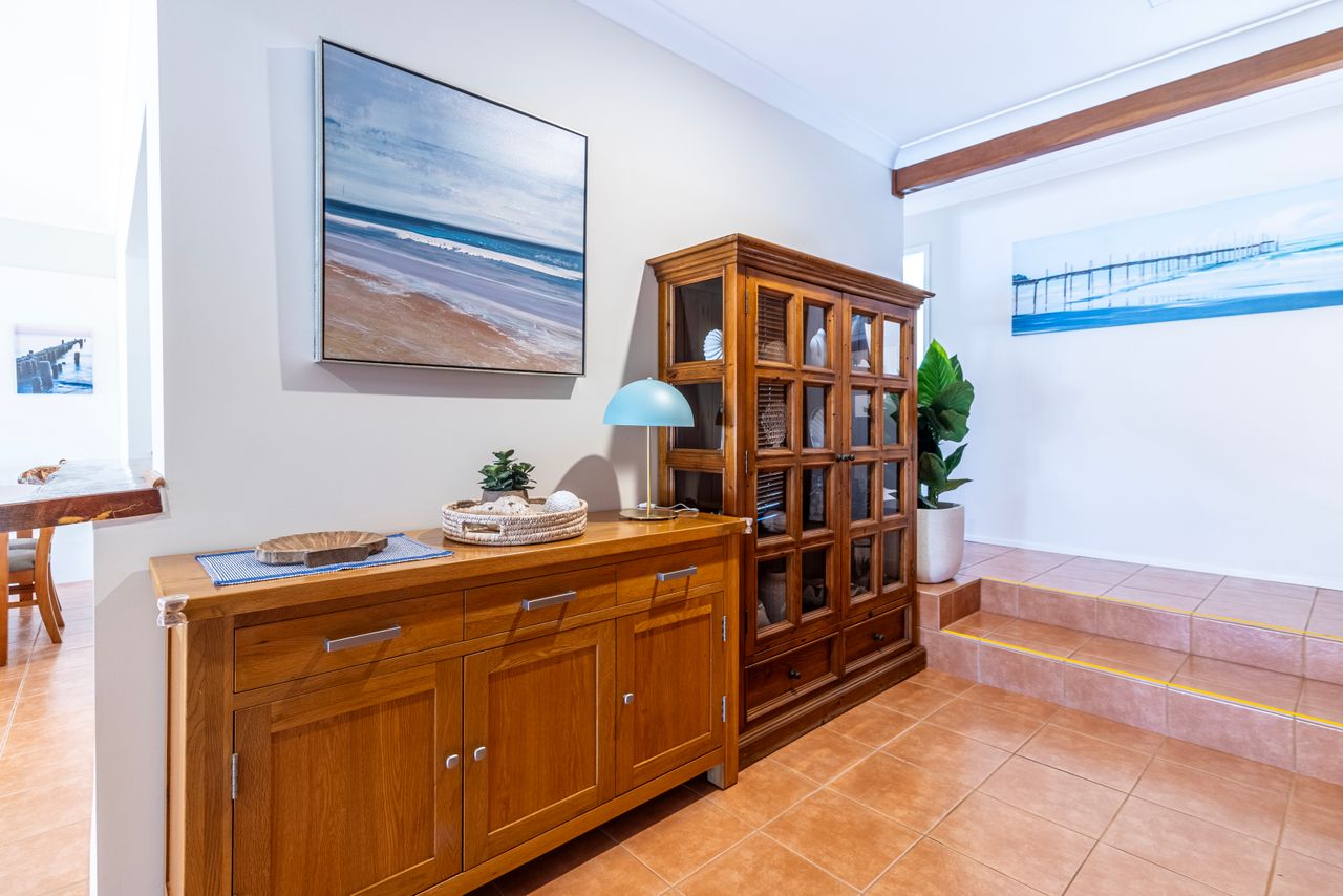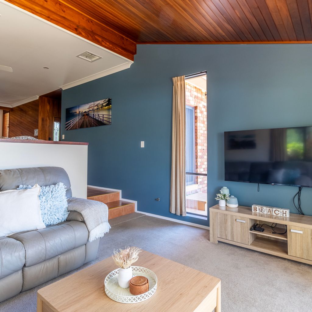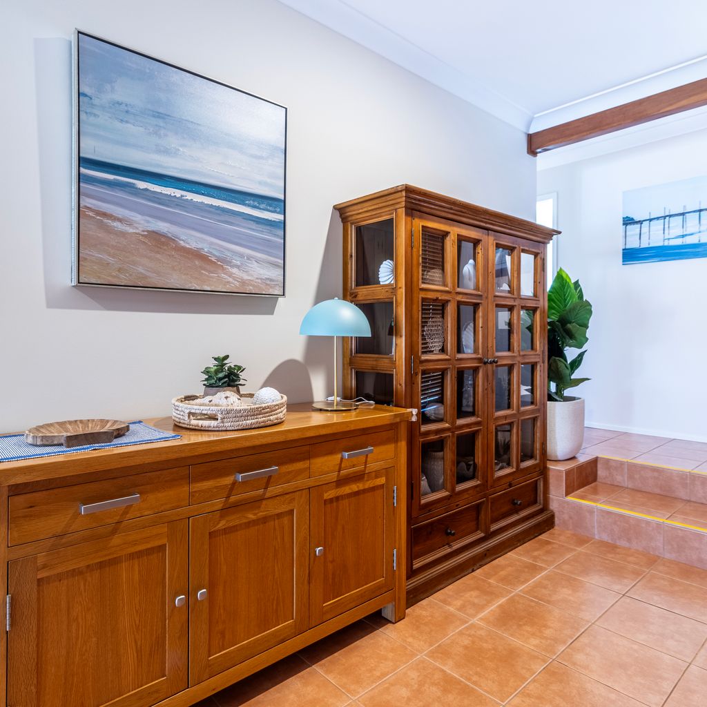 As you enter the home, you’re greeted into an entry area styled with coastal décor and wooden furniture, setting the tone for a relaxed seaside experience. The hallway leads to the three bedrooms, each with built-in wardrobes and ceiling fans for added comfort. One bedroom features access to a private covered patio, complete with a small table and chairs—an ideal spot for some down time.
