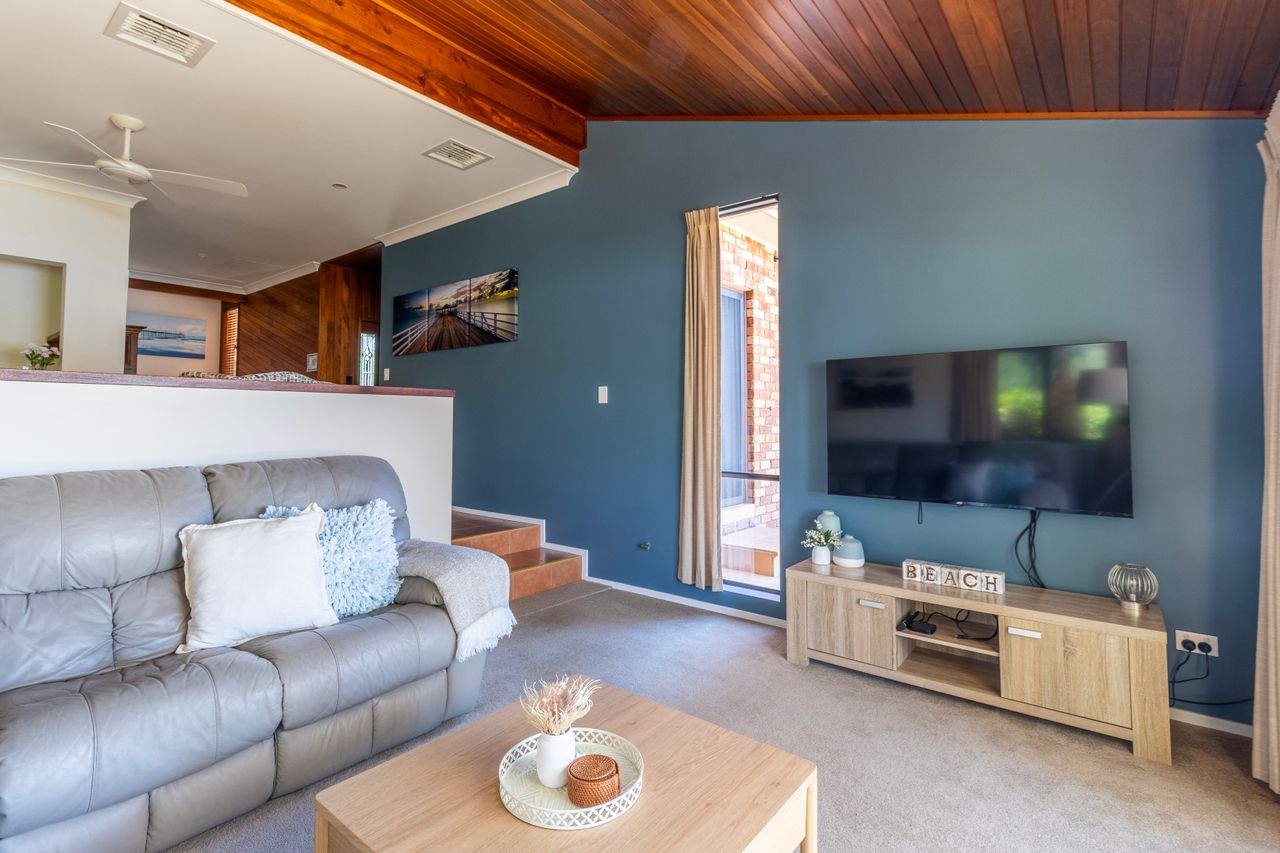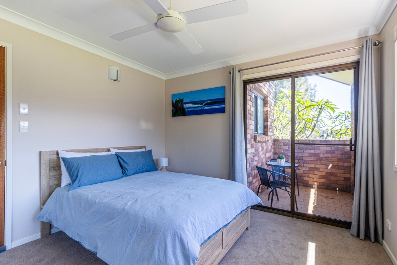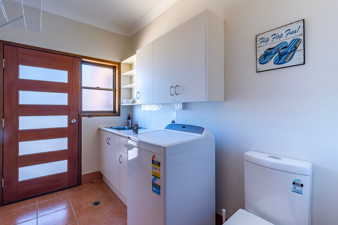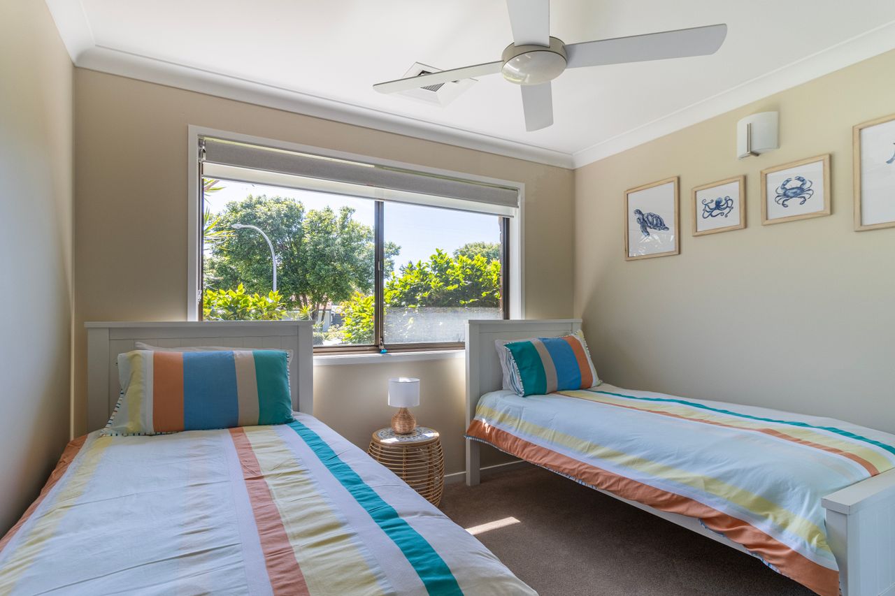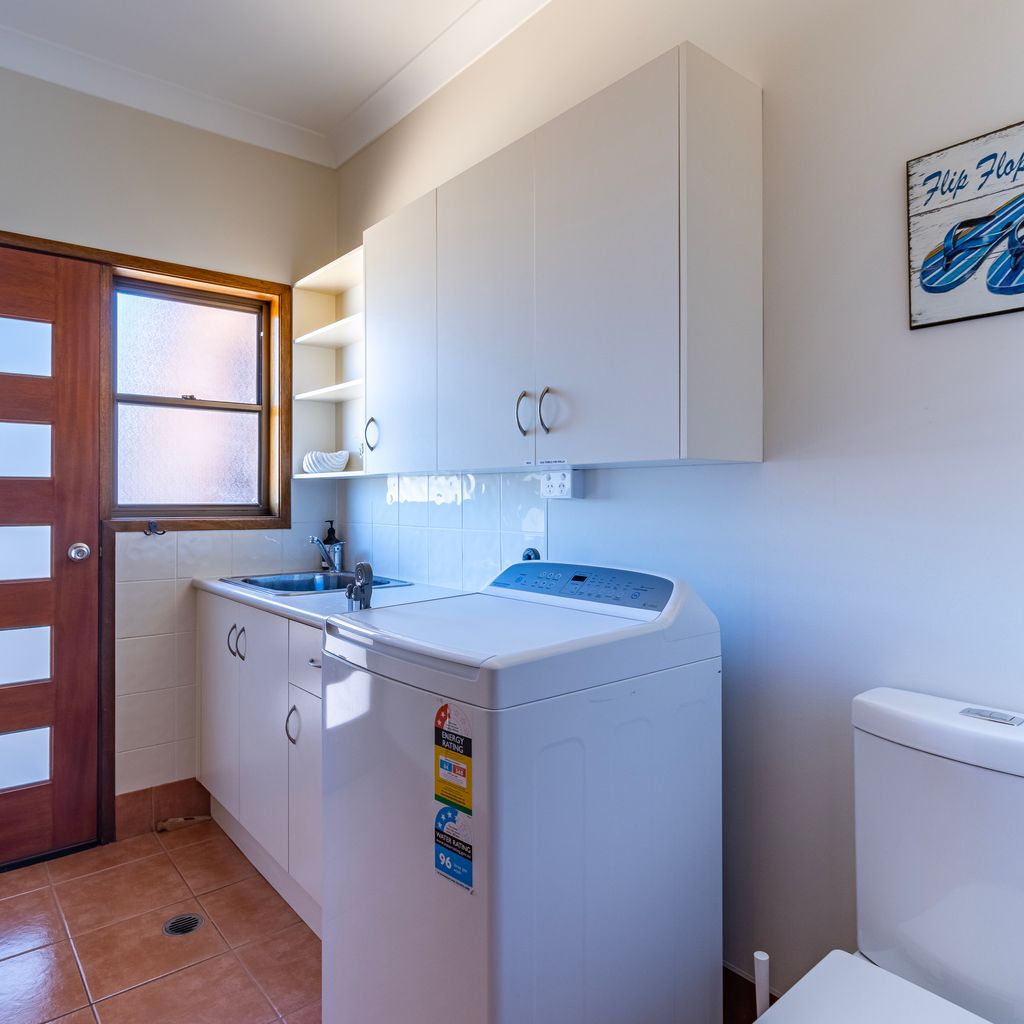 As you enter the home, you’re greeted into an entry area styled with coastal décor and wooden furniture, setting the tone for a relaxed seaside experience. The hallway leads to the three bedrooms, each with built-in wardrobes and ceiling fans for added comfort. One bedroom features access to a private covered patio, complete with a small table and chairs—an ideal spot for some down time.