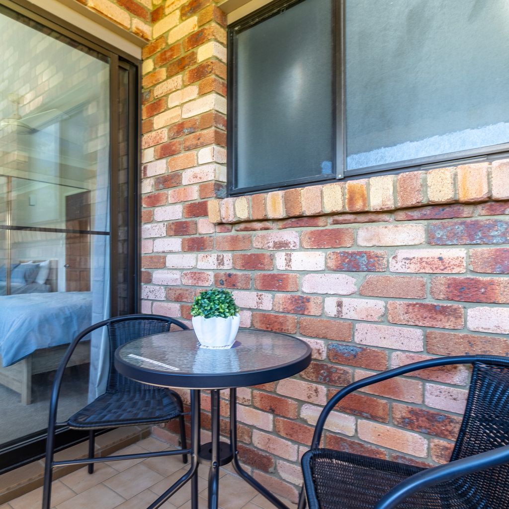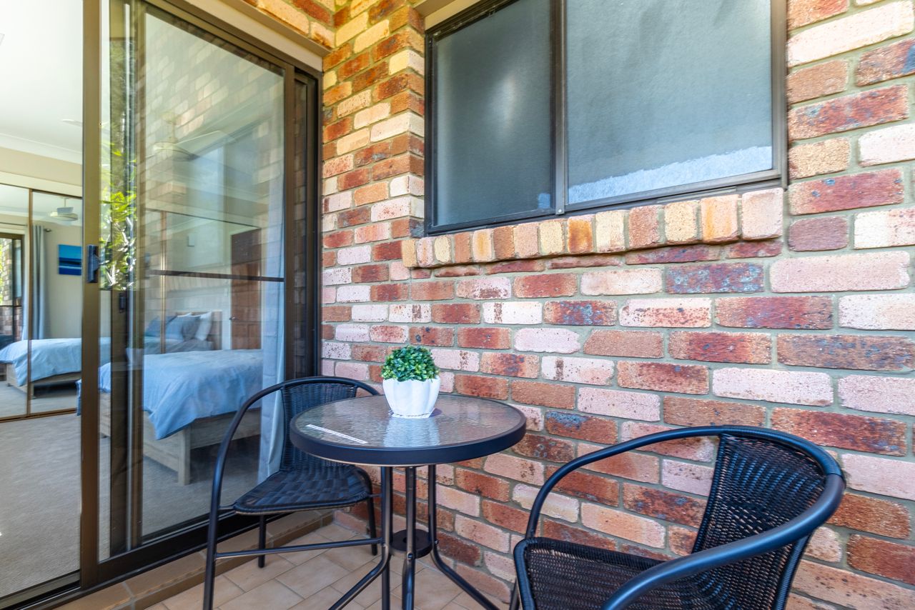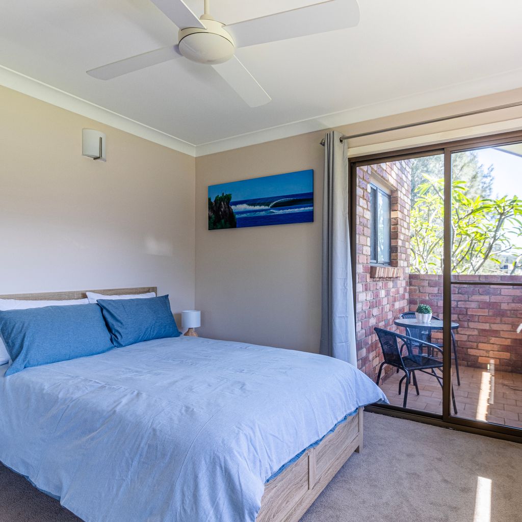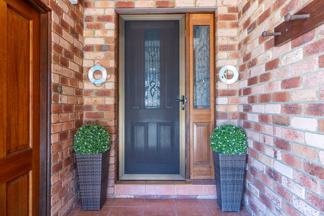 As you enter the home, you’re greeted into an entry area styled with coastal décor and wooden furniture, setting the tone for a relaxed seaside experience. The hallway leads to the three bedrooms, each with built-in wardrobes and ceiling fans for added comfort. One bedroom features access to a private covered patio, complete with a small table and chairs—an ideal spot for some down time.