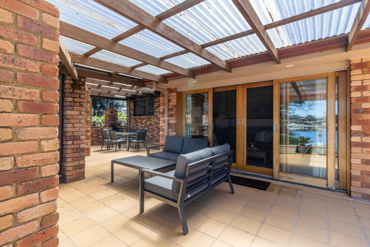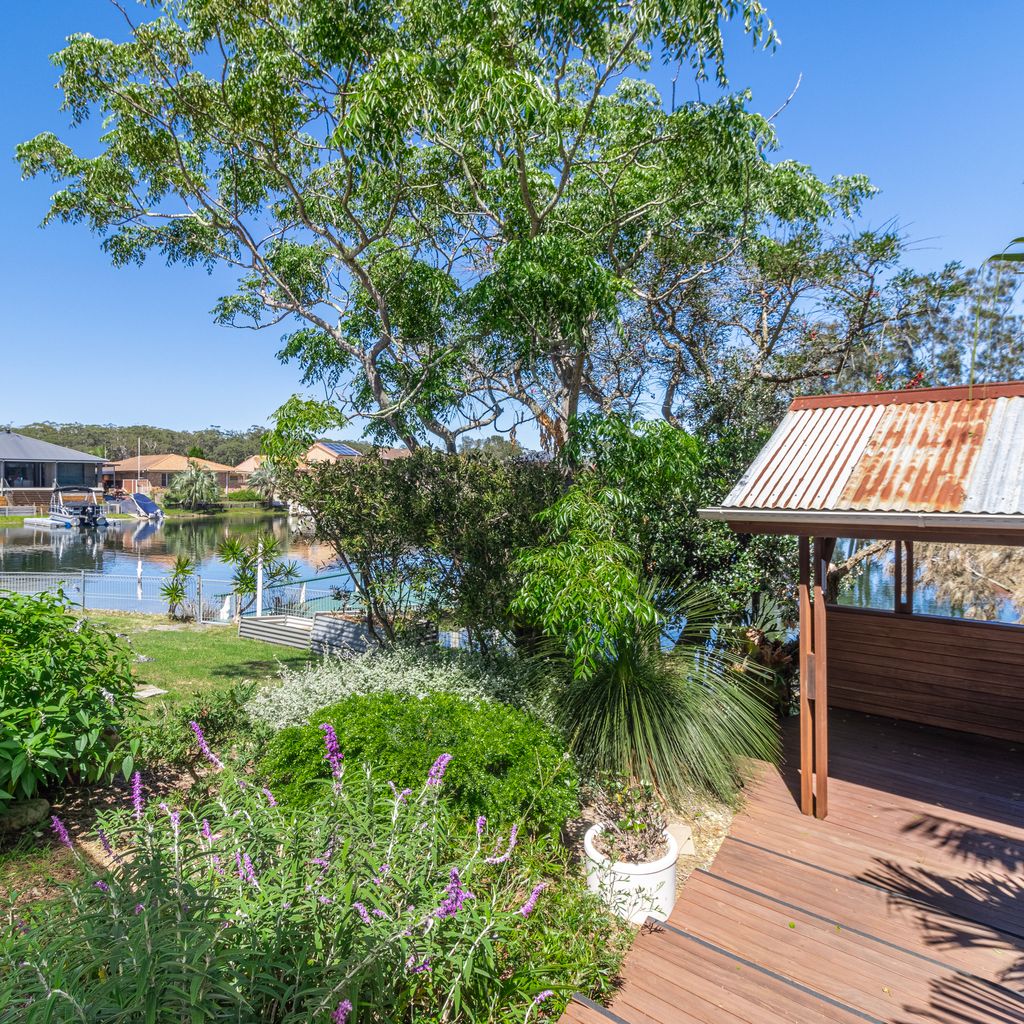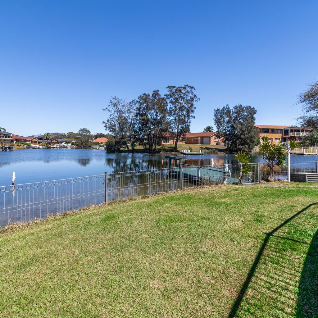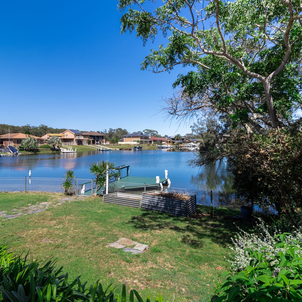 Step outside to the expansive covered patio, a perfect space for family gatherings or quiet afternoons by the water. Featuring ample seating, an outdoor dining setting, and relaxing lounges, it’s the ultimate spot to enjoy the serene surroundings. A deck leads you to a hidden deck area and down to the backyard, which is spacious, child-friendly, and fully fenced along the water’s edge.