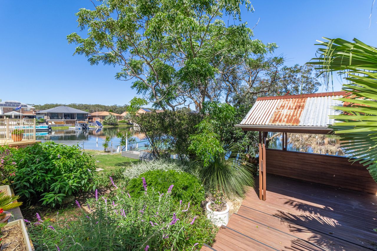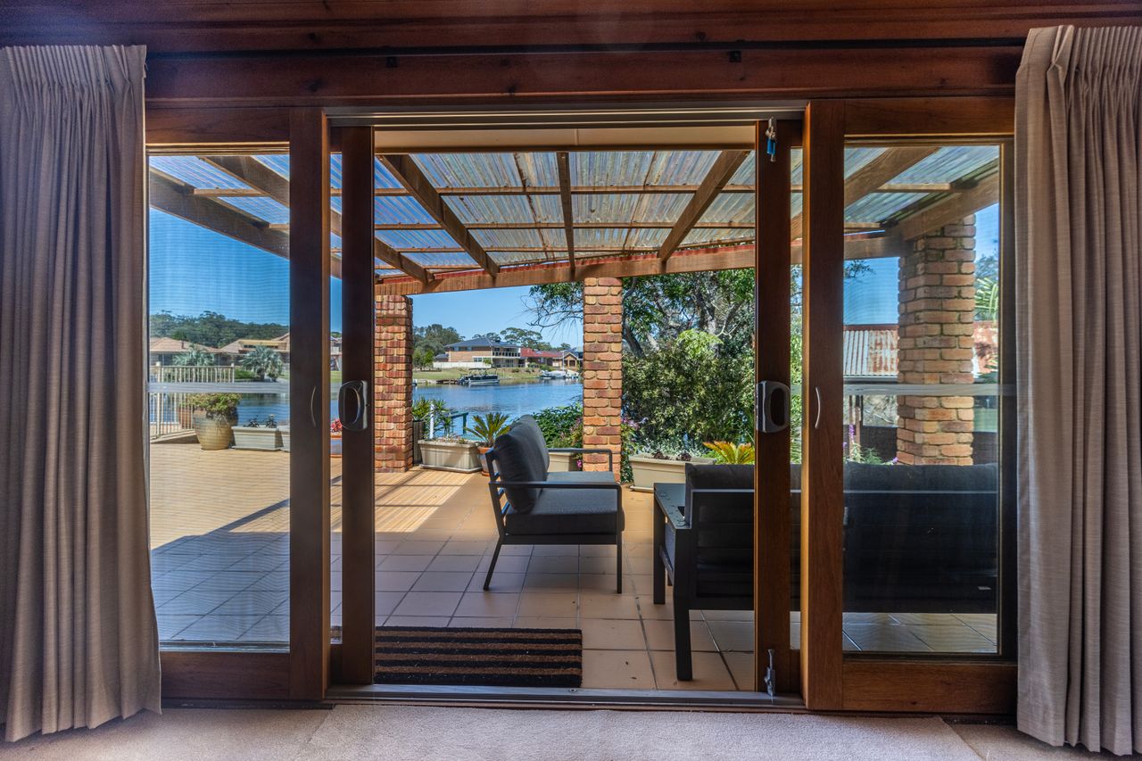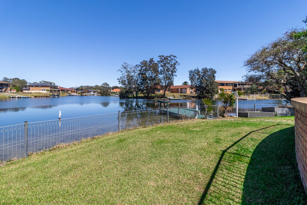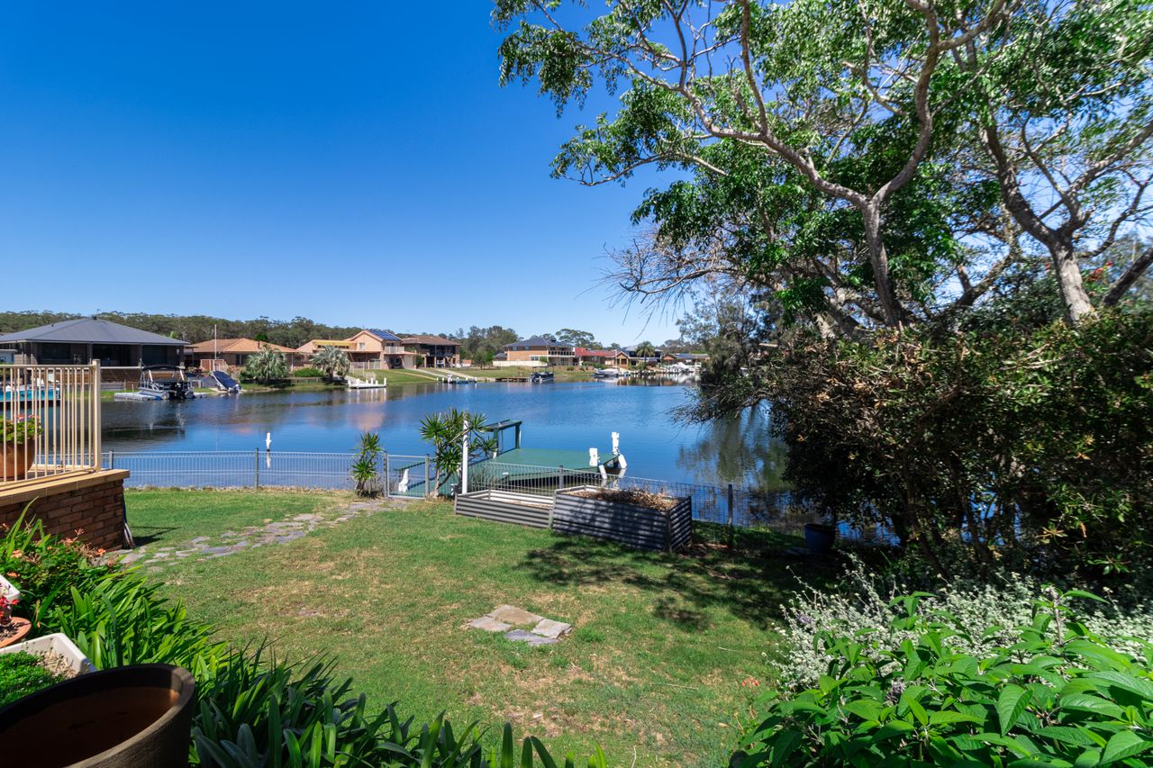 Step outside to the expansive covered patio, a perfect space for family gatherings or quiet afternoons by the water. Featuring ample seating, an outdoor dining setting, and relaxing lounges, it’s the ultimate spot to enjoy the serene surroundings. A deck leads you to a hidden deck area and down to the backyard, which is spacious, child-friendly, and fully fenced along the water’s edge.