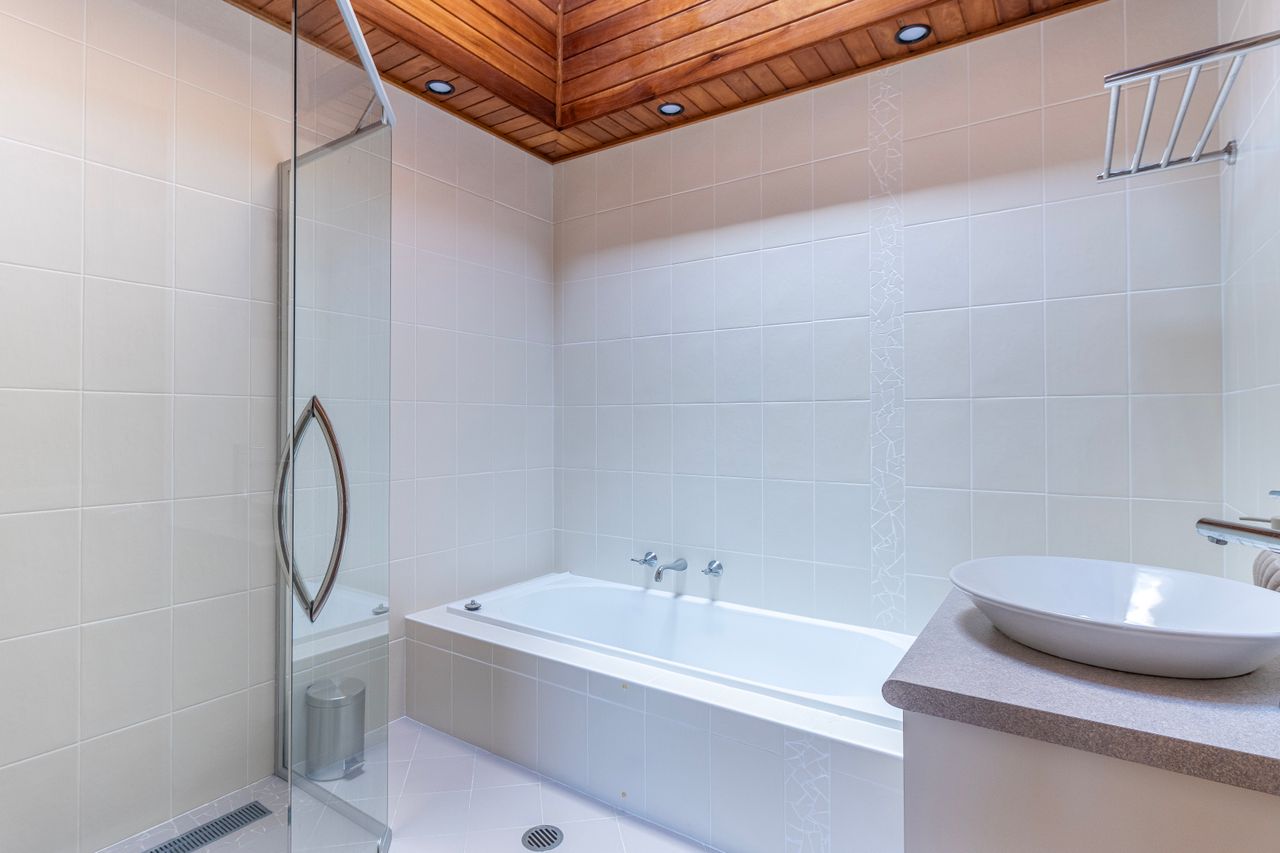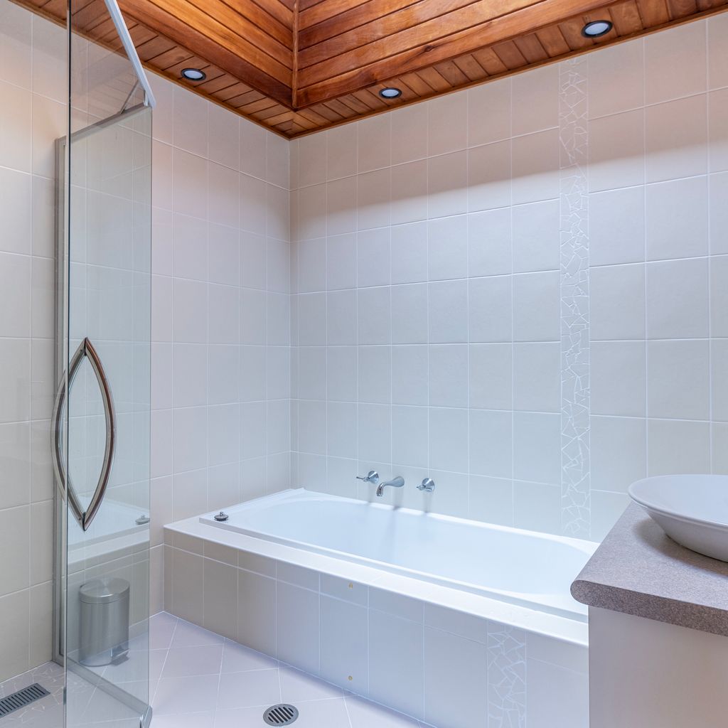 The bathrooms are spacious and thoughtfully designed. One bathroom features a bathtub under a cedar ceiling void with a skylight, creating a serene, spa-like ambiance. Both bathrooms are conveniently located at either end of the hallway.