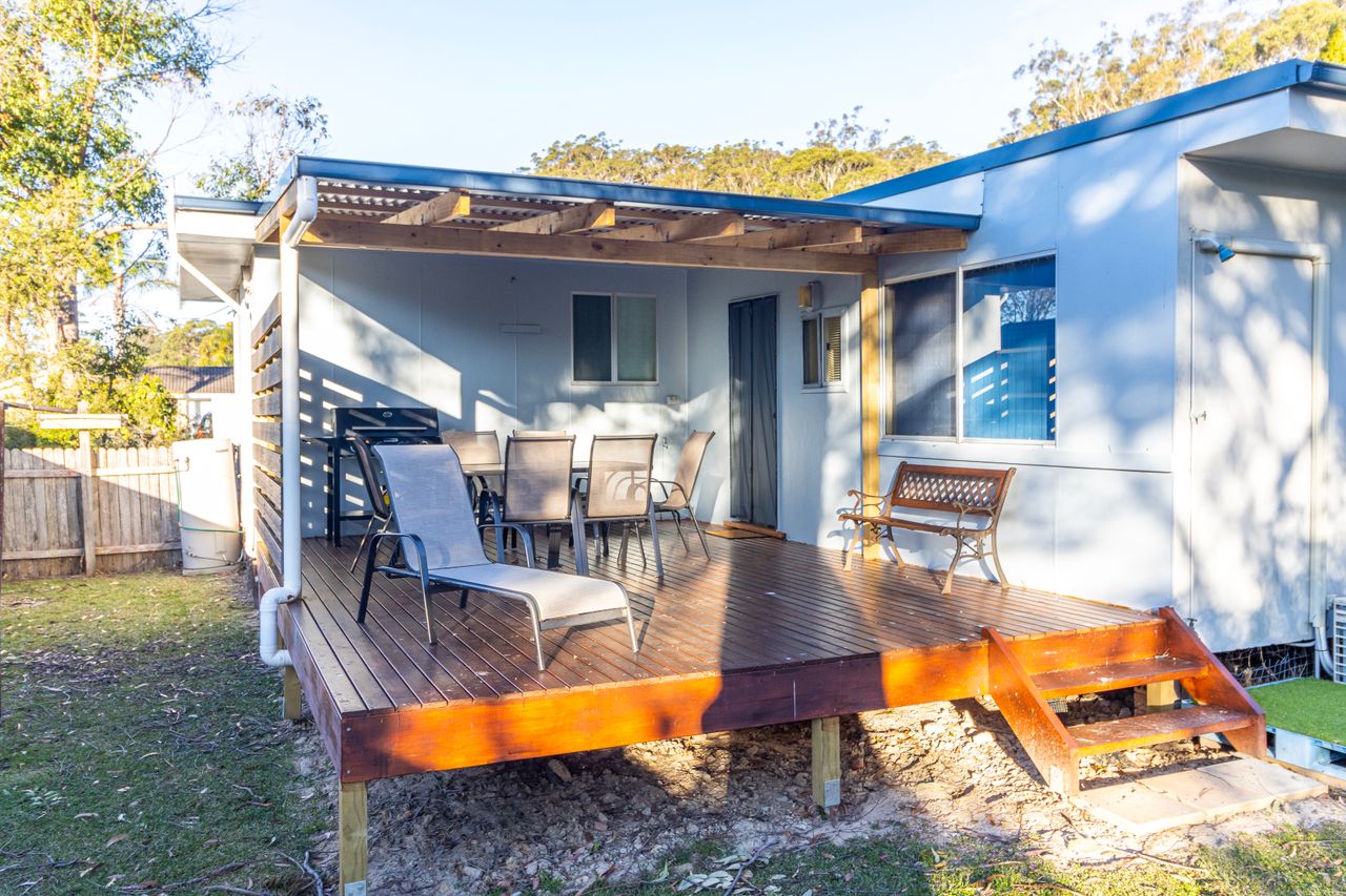 Gail - 31st March 2018From the moment you park in the undercover carport and walk straight through to the front door, you feel relaxed and ready to enjoy your time in this very special location. Sussex Cottage is a lovely, clean and tidy, bright and airy, comfortable and uncluttered (which I especially like) beach house, with a great back yard for children and pets to run around in...the yard is fully fenced, should you need to duck round the corner to the General Store. Great accommodation for a family of 6, or in my case, just for one person with my 2 small dogs. Floorboards make for an easy living style and there are plenty of spaces in the house for everyone to enjoy. The smaller style kitchen provides your basic cooking utensils, pans and crockery, or you can use the bbq on the undercover back balcony, just bring your all grocery needs along. Plenty of board games for the kids and adults. I thoroughly enjoyed my few weeks here, it is a quiet location nearing on the edge of a National Park, and regular sightings of native birds and kangaroos makes it all the more special. It is only a short walk to the lakes and parks, and in very close proximity to your choice of beaches to drive to. I will definitely return with the family, there is so much to do and see here.