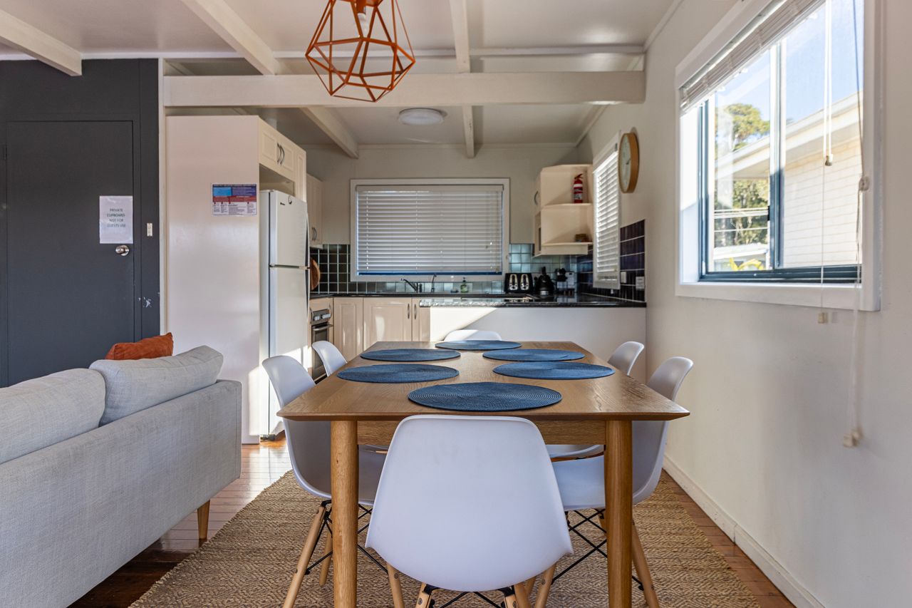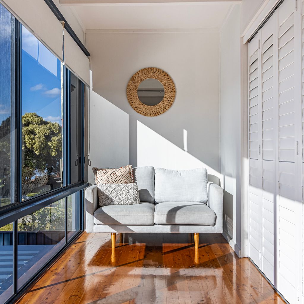 Climb the stairs and be greeted by panoramic views of the water and a light-filled open-plan living area. The modern kitchen is stocked with everything you need and offers ample bench space for meal prep, drinks, and entertaining. It flows seamlessly into the dining area, where you can enjoy meals with a view.