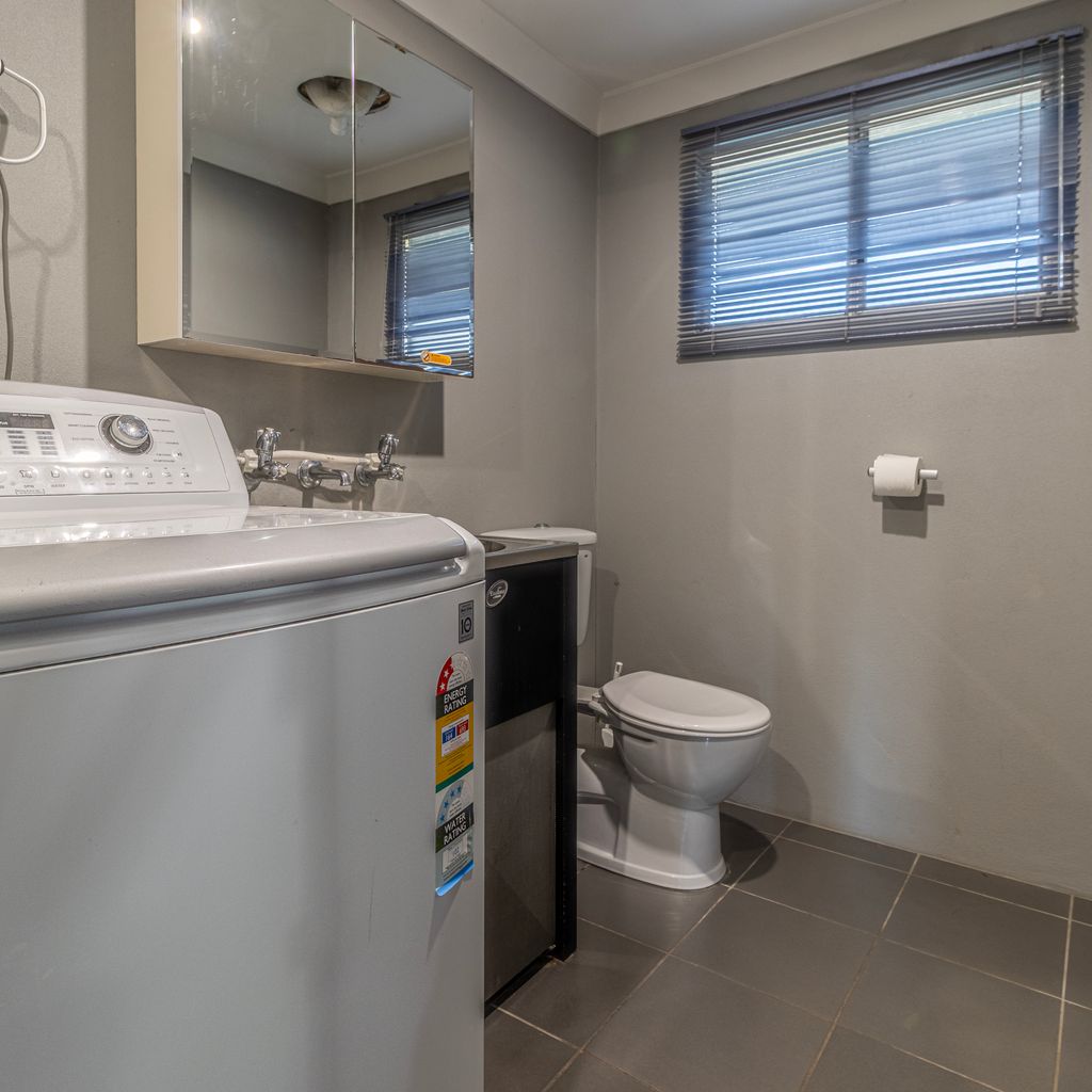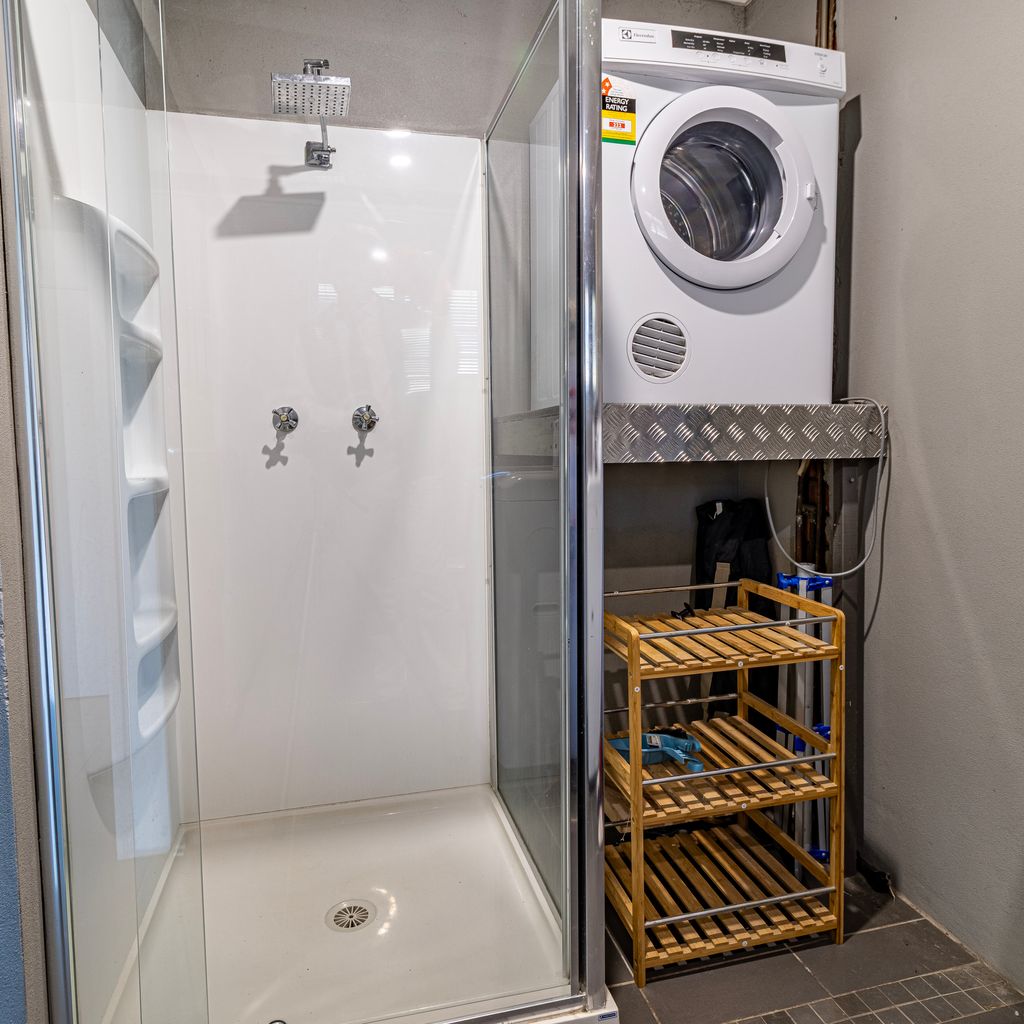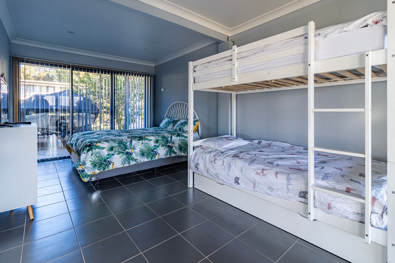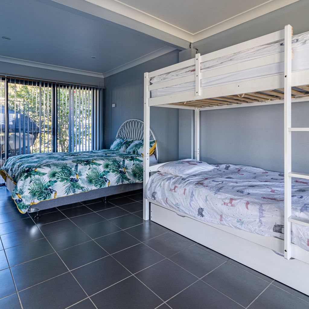 Just beyond is a downstairs bedroom, fitted with a double bed and bunk beds, along with its own TV and drawer storage — ideal for a kids' zone or shared sleeping space. Across the hall is the combined laundry and bathroom, with a shower, toilet, washing machine and dryer, offering convenience for days spent in and out of the backyard or off the boat.