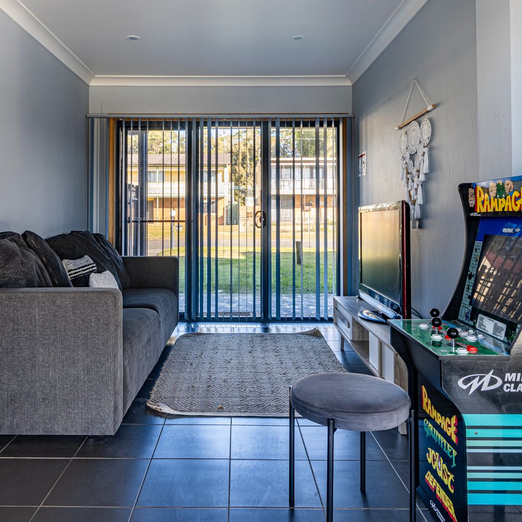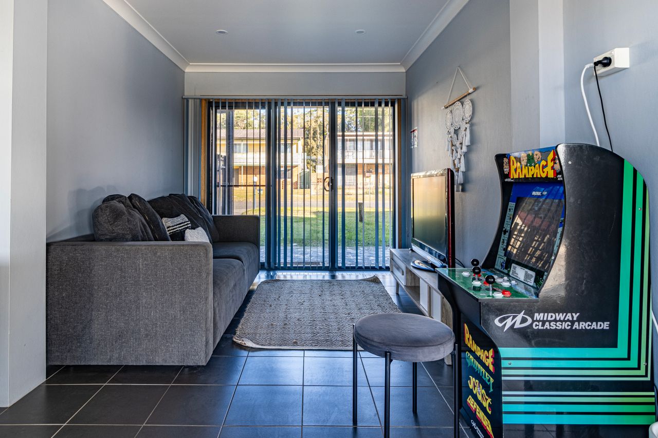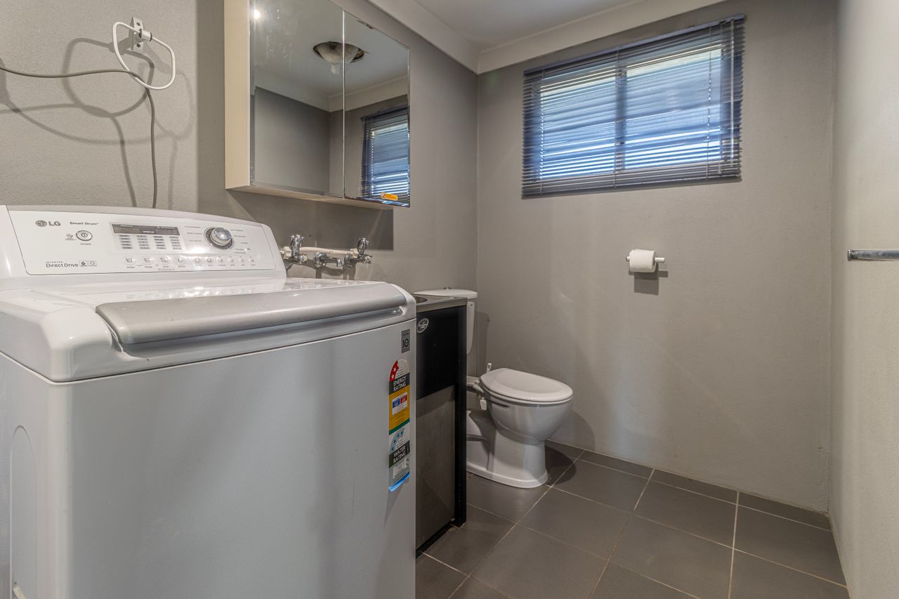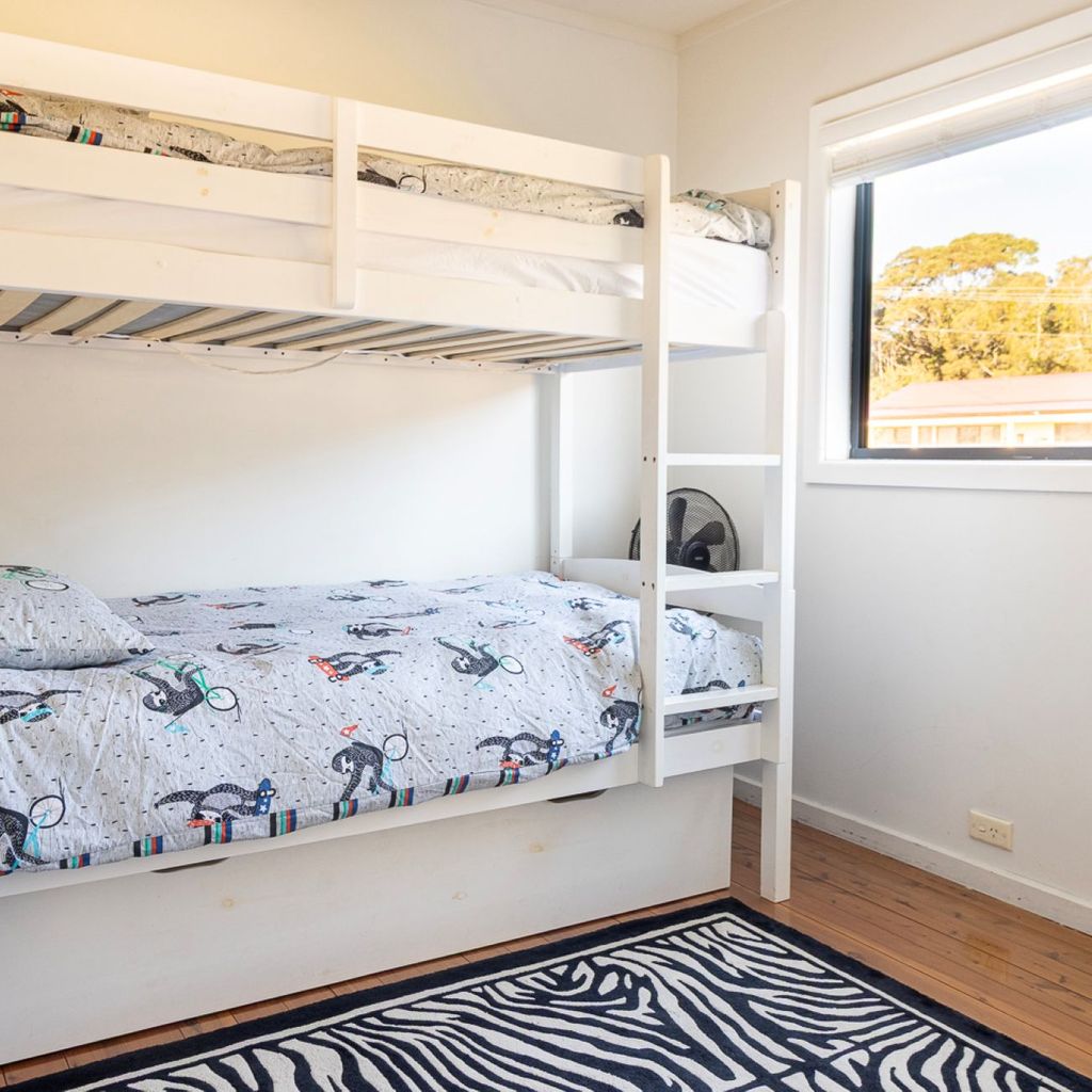 Just beyond is a downstairs bedroom, fitted with a double bed and bunk beds, along with its own TV and drawer storage — ideal for a kids' zone or shared sleeping space. Across the hall is the combined laundry and bathroom, with a shower, toilet, washing machine and dryer, offering convenience for days spent in and out of the backyard or off the boat.
